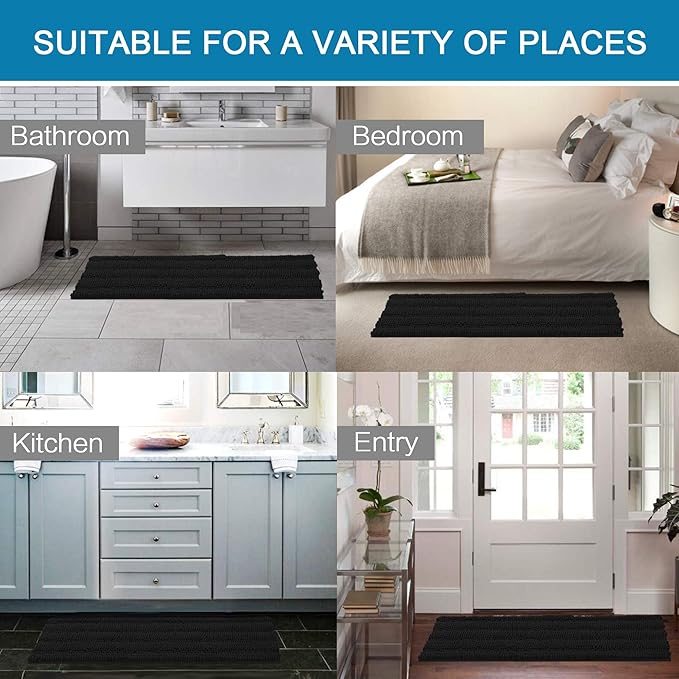 H.VERSAILTEX Bath Rugs for Bathroom Non Slip Bath Mats Extra Thick Chenille Striped Bath Rug Runners 47" x 17" Absorbent Fluffy Soft Shaggy Mats Dry Fast Plush Area Carpet for Bath Room - Black
