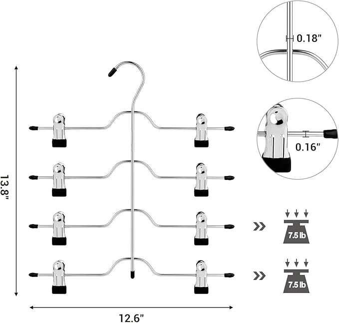 - A TOUCH OF GLITTER: No one wants to wrestle through the messy drawers to find the right skirt each morning; this 4-tier metal trousers hanger in silver chrome finish displays your clothes in a streamlined way while adding style to your closet