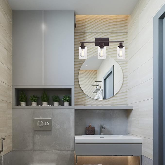 MELUCEE 3 Light Bathroom Vanity Light Oil Rubbed Bronze, Industrial Wall Light Fixture with Clear Glass Shade Sconces for Bedroom Porch Kitchen Living Room (Patent No.: US D963914 S)