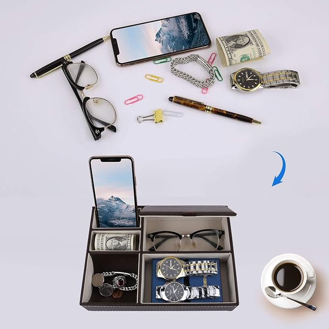 - 【Perfect Storage Tray】Mens jewelry holder can store various personal items, such as mobile phones, glasses, watches, headphones, charging cables, keys, etc. You can prepare for going out the next day in advance, perfect for saving your time.