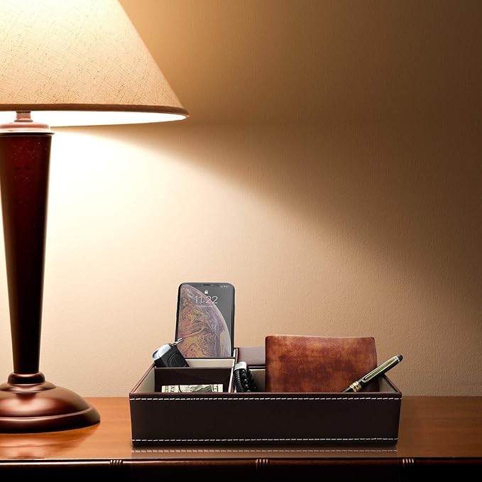 - 【Widely Use & Stylish Decoration】The leather valet tray organizer is suitable for dressers, desks, badroom,entryway table,nightstand,living room to help your organize personal small items. The spacious brown leather tray makes it easy to find items at a glance.