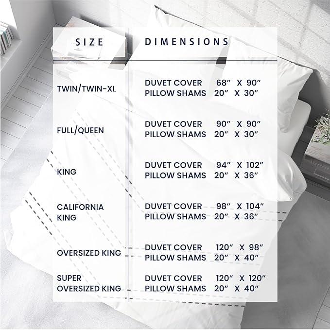 - OVERSIZED KING SIZE DUVET COVER SET – LUXURY HOTEL QUALITY: Includes 1 Oversized King Duvet Cover (120" X 98") and 2 Pillow Shams (20" X 40") for a perfect fit. Comforter not included. Please measure your insert before purchasing.