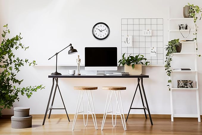 - Decorate and enhance your home or work space with this classic analog black retro clock. The perfect clock for your office, school classroom, kitchen, dining room, bedroom, bathroom, living space, restaurant or diner