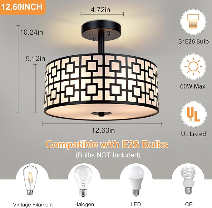 - Perfect Size for Any Room: With dimensions of 12.6"L x 12.6"W x 10.2"H, this bedroom ceiling light offers ample light without overwhelming your space. It’s ideal for bedrooms, kids’ rooms, offices, dining rooms, laundry rooms, and more. Whether you're a homeowner, designer, or renter, this stylish ceiling light fits effortlessly into any setting