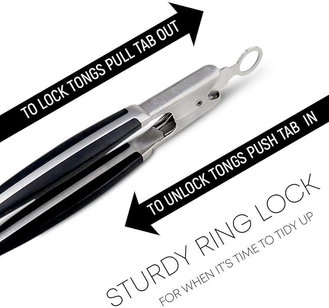 - Strong tongs: Did someone say meat! No problem! Because these Stainless Steel grilling tongs are thick, strong and long to pick up things like a 2lb steak! The scalloped edge will never bend under the pressure or cut into your food! Not only are these the longest food tongs you’ve seen (18”), but the comfy handle dissipates heat, too. Also comes with sturdy ring lock for when it’s time to tidy up.