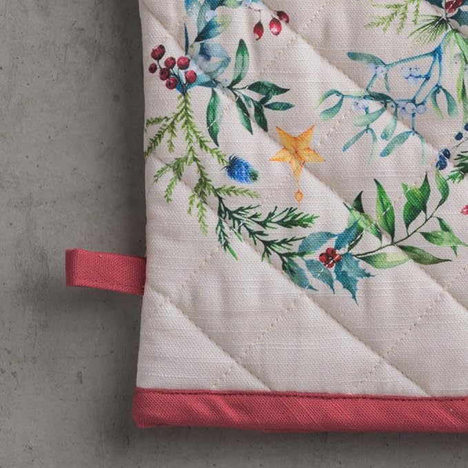 Maison d' Hermine 100% Cotton Oven Mitt & Pot Holder Set (7.5"x13" & 8"x8") Heat Resistant BBQ Cooking Gloves with Loop for Thanksgiving Christmas Decorations Handling Hot Pans (Holly Time)