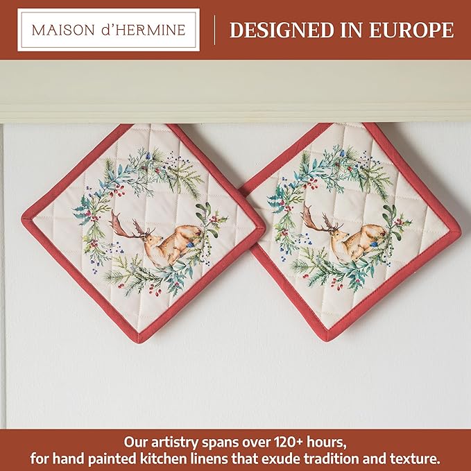 Maison d' Hermine Pot Holders Set 100% Cotton Heat Resistant Potholders 8" x 8" Hot Pads with Loop for Thanksgiving Christmas Decorations BBQ Cooking Baking Handling Hot Pans (Pack of 2, Holly Time)