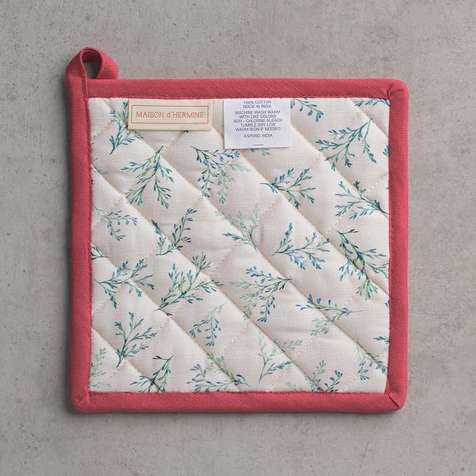 - Package Includes: Set includes 2 pot holders measuring 8" x 8", perfect for handling hot pots, pans, and dishes safely. Made from 100% cotton for reliable heat protection and durability. Designed in Europe and made in India