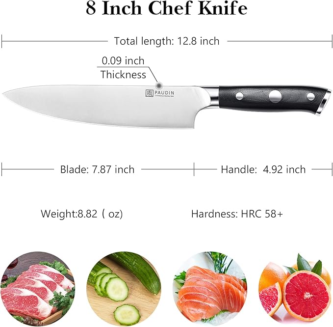 - Professional Kitchen Knife -- Each PAUDIN cooking knife blade is painstakingly sharpened. The thickness of this chef knife is 2.3mm. The blade edge is 14-16 degrees per side, which is sturdy and sharp to cutting the vegetables, meat, fruit, fish and so on perfectly.