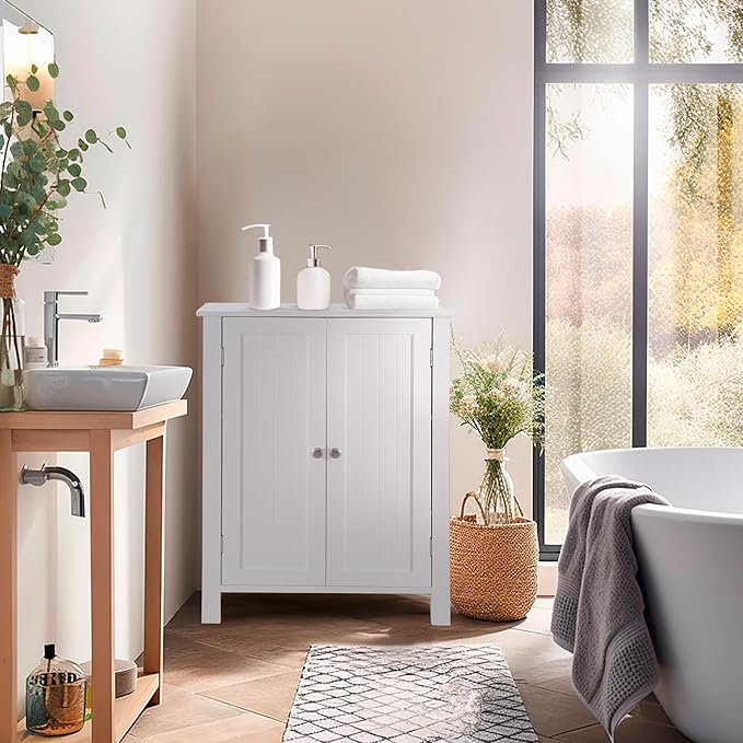 ZENY Bathroom Floor Storage Cabinet with Double Door + Adjustable Shelf, Wooden Organizer Cabinet for Living Room, Bathroom, Bedroom, Modern Home Furniture (White)