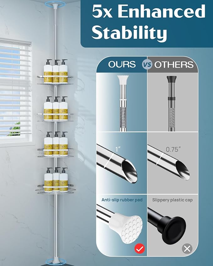 - [Robust and Adjustable]: Enjoy hassle-free adaptability with our bathroom shower shelves! Engineered with a strong spring mechanism, this tension shower caddy corner offers significant adjustability within a 34 to 116 inch range, providing a secure fit and stable positioning without any fuss. Please note that this shower rack is designed for standard ceilings and is not suitable for sloped ceilings