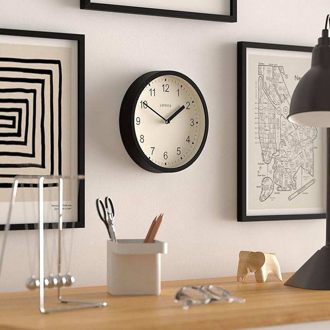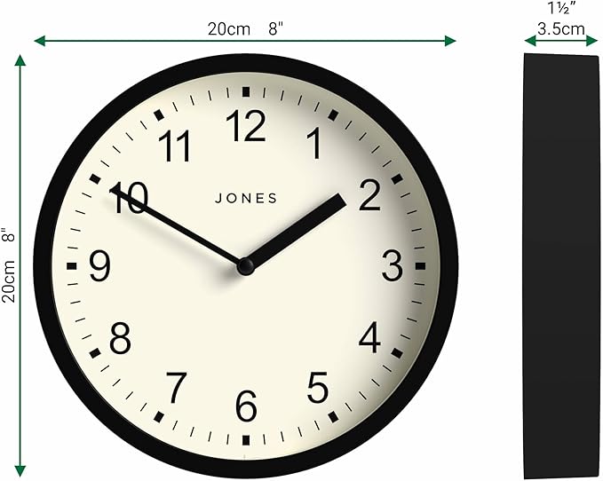 JONES CLOCKS® Spin Wall Clock | Small Modern Round Clock | 8 inch | Black | Easy to Read Numbers | Ideal for Kitchen, Office, Children’s Room or Any Small Space