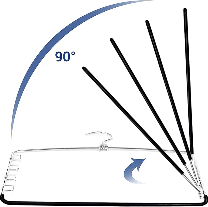 - Multiple trouser hangers - Each trouser hanger has 4 arms that can swing out 300°, which is convenient for putting on and taking off pants without messing up the rest. Unique metal hook design can be rotated 360°. It's easy to find the right clothes, save your time to match clothes.