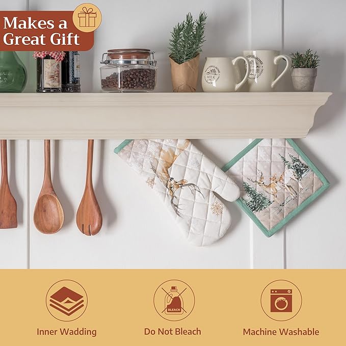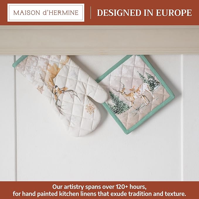 Maison d' Hermine 100% Cotton Oven Mitt & Pot Holder Set (7.5"x13" & 8"x8") Heat Resistant BBQ Cooking Gloves with Loop for Thanksgiving Christmas Decorations Handling Hot Pans (Deer in The Woods)