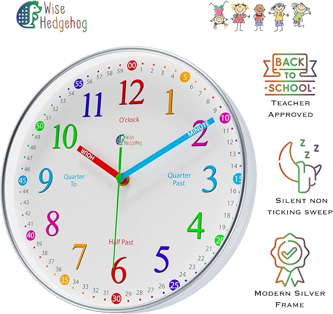 - COMPLETELY SILENT, WONβT KEEP ANYONE UP - Our telling time teaching clock is a quiet clock with a stylish continuous sweep movement, making it great room & wall decor for kids' rooms, nurseries, or homeschool classrooms.