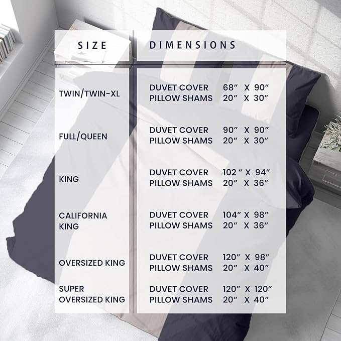 - OVERSIZED KING SIZE DUVET COVER SET – LUXURY HOTEL QUALITY: Includes 1 Oversized King Size Duvet Cover (120" X 98") and 2 Pillow Shams (20" X 40")- DESIGNED FOR LARGE INSERTS ONLY. COMFORTER NOT INCLUDED. Recommended Insert Size: Fits upto 116"x96" inserts . Not compatible with standard King inserts. Please check your insert size before ordering.