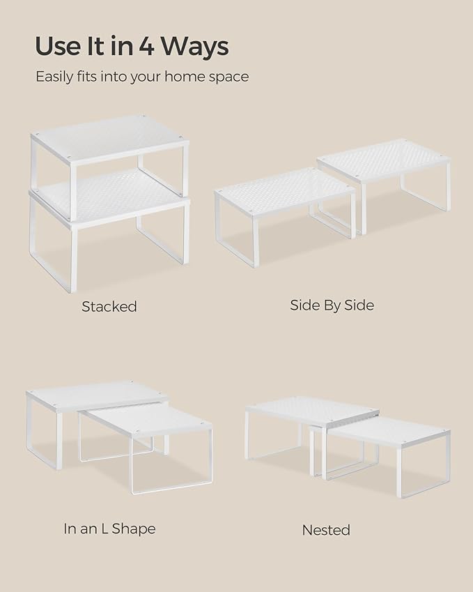 - [Maximize Your Storage] If you have a large cupboard but your items still have nowhere to go, try this set of 2 cabinet organizers—it takes full use of the vertical space and doubles your storage space