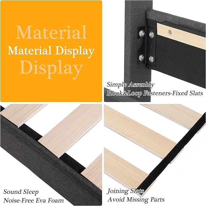 - 【Noise Free Structure】Equiped with extra quiet straps on the queen bed frame, this can effectively reduces noise and rattles, so you can enjoy every quiet &comfortable night. 8" under-bed space is perfect for storing shoes, small storage boxes and more.