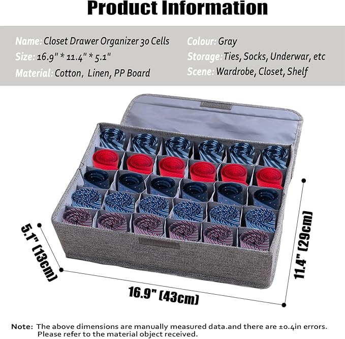 - 👍【1 Pack with 30 Cells】You will receive 1 pc fabric clothes drawer organizer which mesures 16.9''*11.4''*5.1''. The closet drawer box has 30 individual cells, perfect for organizing socks, pantyhose, underwear, neck ties, scarves and other accessories. Keep clothes neat and orderly, perfect for organizing.