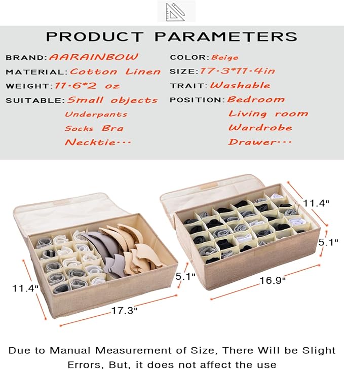 - 👍【2 Pack with 48 Cells】You will receive 2 pcs foldable clothes drawer organizers, each mesures 16.9''*11.4''*5.1''. One 30 individual cells as socks, pantyhose, underwear, and other accessories organizer, and the other one 16 cells as neck ties, scarves, shirt and bra organizer. Keep clothes neat and orderly, perfect for organizing.