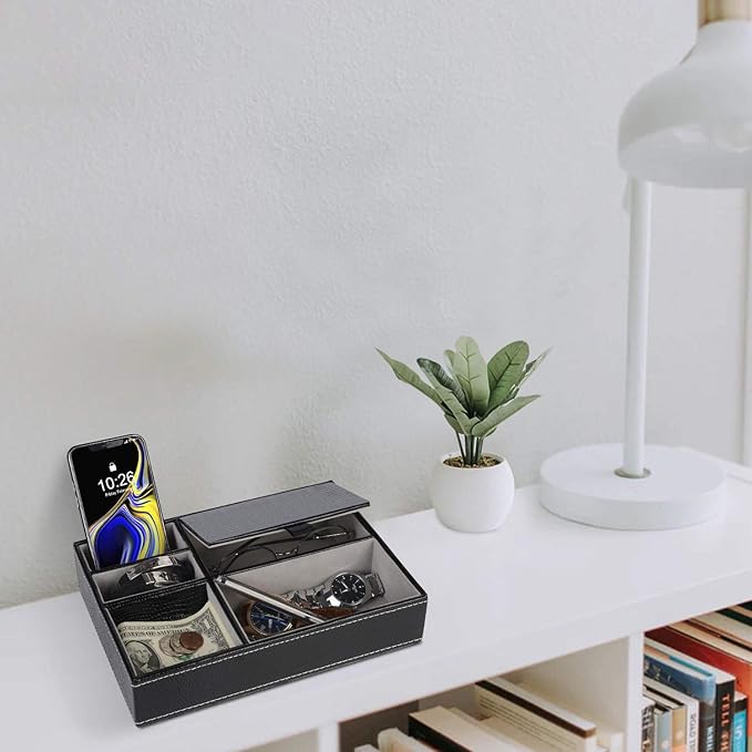 - 【Perfect Storage Tray】Mens Valet Box can store various personal items, such as mobile phones, glasses, watches, headphones, charging cables, keys, etc. You can prepare for going out the next day in advance, perfect for saving your time.