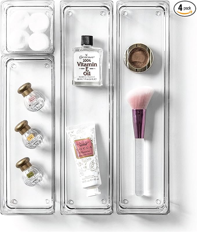 - Size Variety for Every Need: This set includes four bins in different sizes – (2) Medium- 9.4""x 3.1""x 2"", (1) Small- 6.3""x 3.1""x 2"", and (1) X-Small- 3.1""x 3.1""x 2"". Whether you need a vanity organizer for makeup, desk organizer bins, or drawer trays for organizing bathroom essentials, these bins have you covered.