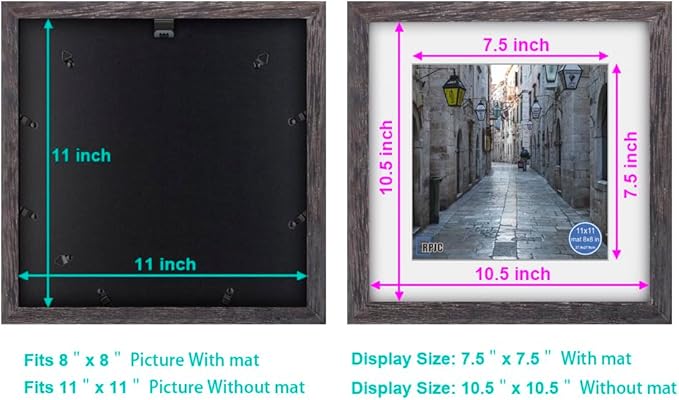 - Size:Fits 8 by 8 with Mat or 11x11 Without Mat Photos , Actual Frame size (finished size) 12.5"x12.5"x0.75" .