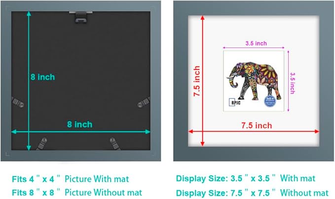 - Size:Fits 8 by 8 inchprints without mat or 4 by 4 with Mat, Actual Frame size (finished size) 9.3"x9.3"x3/4".