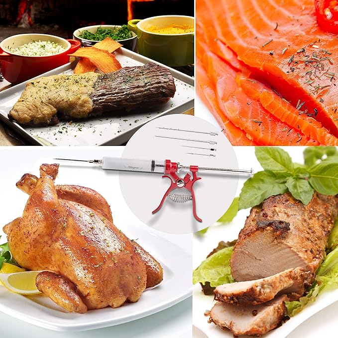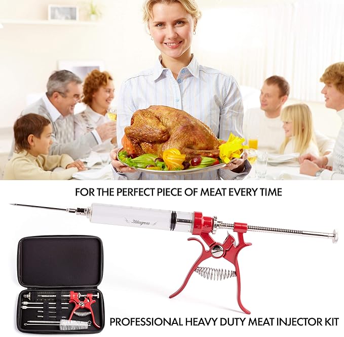 - 👍 Lifetime Guarantee & ECO Friendly Package: 100% safe & healthy kitchen food injector syringe. Turkey injector and Silicone O-rings for spare replacement. Keep your family healthy with meat marinade injector.