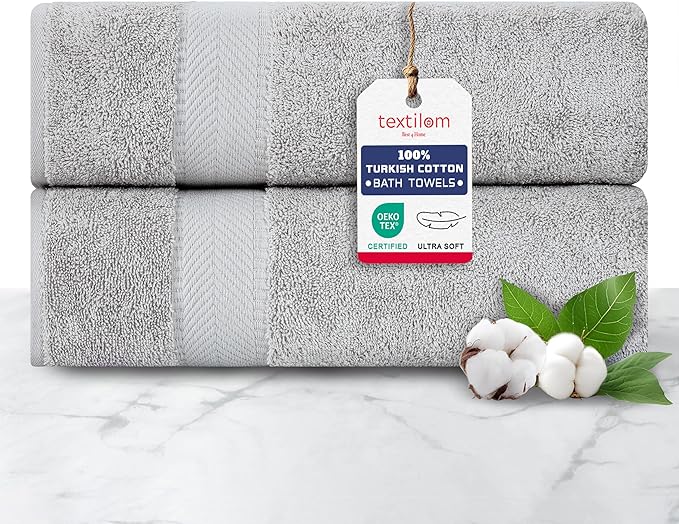 TEXTILOM 100% Turkish Cotton 2 Pcs Bath Towel Set, Luxury Bath Towels for Bathroom, Soft & Absorbent Hotel Quality Bathroom Towels Set (27 x 54 inches)- Light Grey
