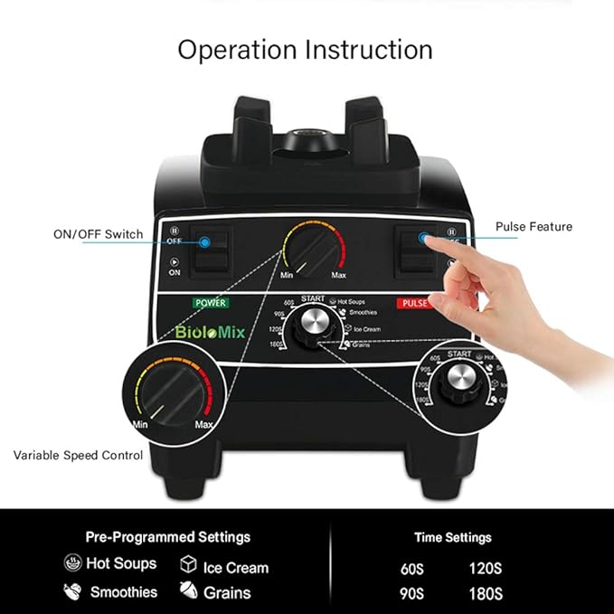 - Easy Manual Operation: The motor based with a easily variable speed control and 4 pre programmmed settings and 4 Timer setting can help to achieve versatile blending features such as emulsify cream, blend frozen treats and baby food, grind nuts and coffee, chop salad and dips, heat soup, crush ice, mix batter for pancakes, waffles, cookies, muffins, crepes, and cakes