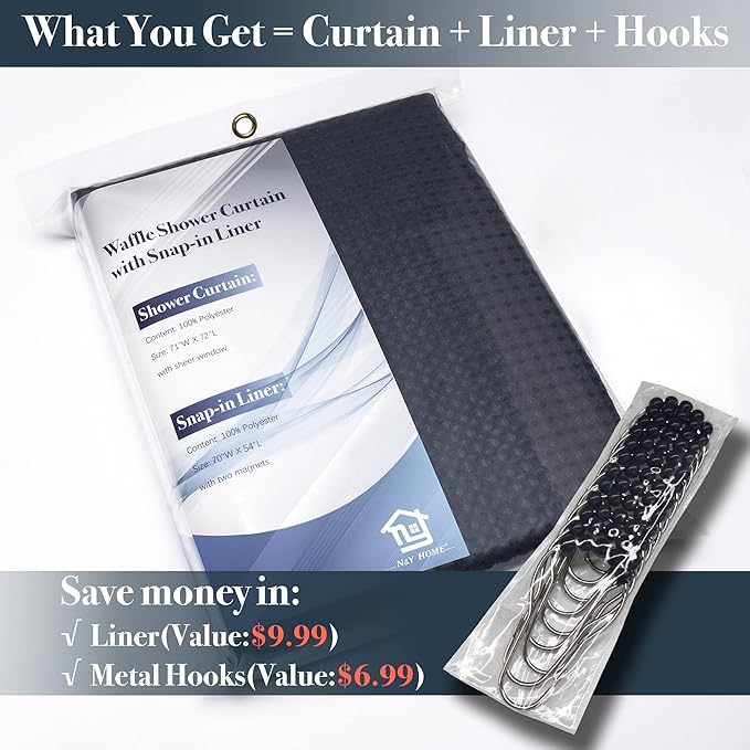 - Smart Design Set & Hotel Style: Waffle weave shower curtain with detachable liner of the same color, and free 12 metal hooks, the entire 3-in1 set offers a complete solution for bathtub or bathroom stall