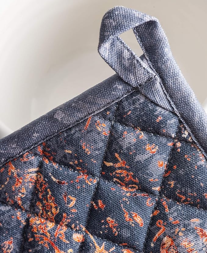 - Premium Quality: Crafted from quilted 100% cotton, this heat-resistant oven mitt and pot holder set protects your hands from hot cookware. Each piece features a built-in hanging loop for easy storage and quick access. This versatile set is perfect for everyday home kitchens, farmhouse kitchens, hotels, restaurants, and bakeries