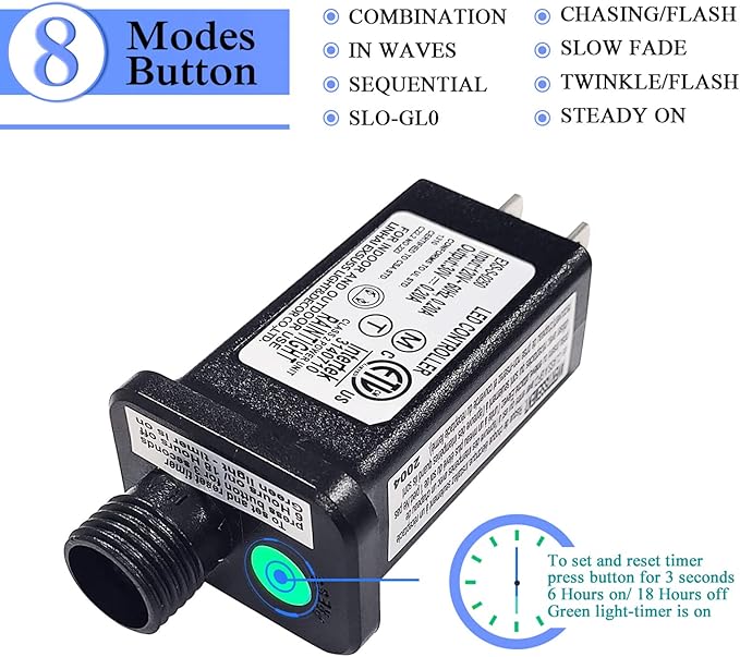 - [8 MODES WITH TIMER] The total length of the our indoor Halloween lights is 91.5ft, 250 LED on 81.7ft light wire and 9.8ft is lead wire. 8 modes can meet your different needs on different occasions. You can change the flash mode by pressing the button on the transformer, including Waves, Combination, Fading, Fireflies, Chasing, Twinkle, Fading slowly, and Steady-on. Our extendable Christmas lights also has a timing function, which automatically turns on for 6 hours and turns off for 18 hours