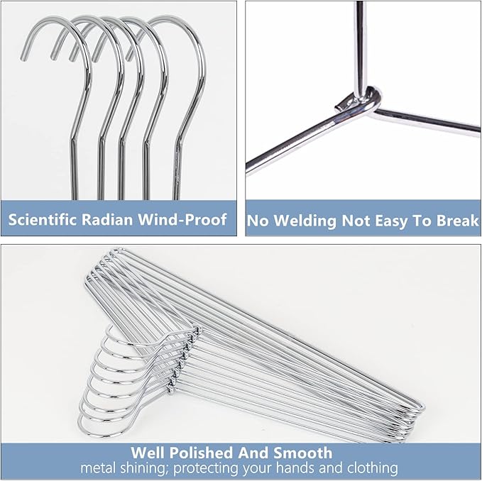 - 【Protect Your Clothes】There are no gaps or sharp edge of the coat hangers for closet, so without scratching your clothes or hands, without wrinkle and bad marks, keeping clothes shape. No welding technology, the chrome hanger is not easy to break and can be used for a long time.
