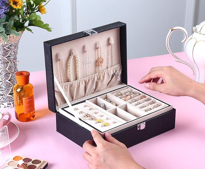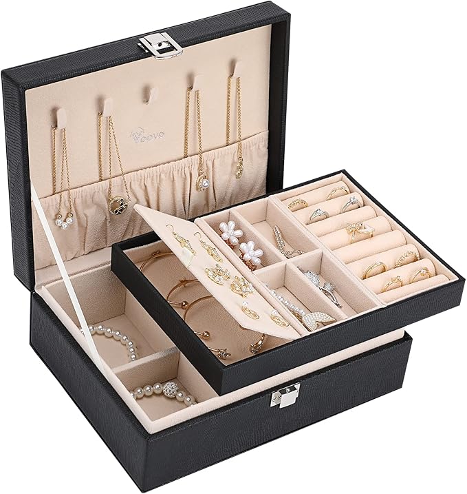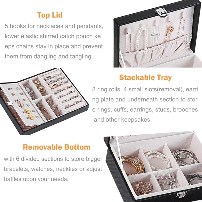 - Well Organized: 2-Layer jewelry box offer adequate area for your fine jewelry. Top lid with 5 hooks for necklaces and pendants, elastic shirred catch pouch keeps chains stay in place; 8 ring rolls, 4 small slots(removable), earring plate and underneath section; 6 divided bottom compartment to store rings, bracelets, cuffs, earrings, studs, brooches, watches and other keepsakes. No longer losing your bling.
