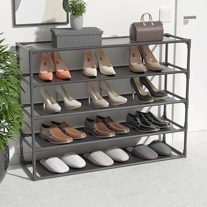 - 2PACK 5-TIER SHOE RACK- Modern minimalist shoe stand designed for small-size areas. One 5-tier shoe rack holds approximately 25 pairs of shoes, measuring 39”L x 11”W x 29”H. It keeps your limited spaces such as entryways, closets, bedrooms, and garages organized.