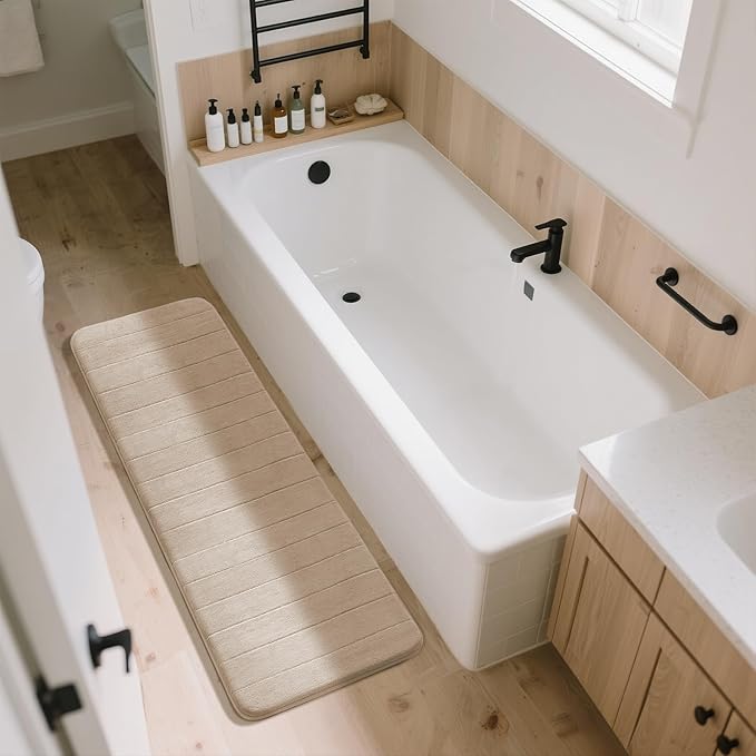 Yimobra Bathroom Runner 60"x24", Non Slip Memory Foam Bath Mat, Super Soft Water Absorbent Hallway Carpet, Machine Washable Rug for Vanity Tub Shower, Beige