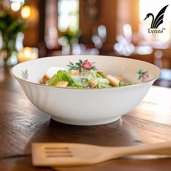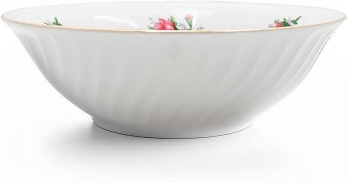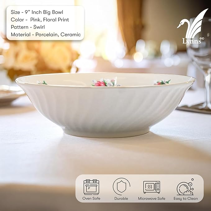 Lynns Paradise Vintage Rose 9-Inch Big Bowl, Set of 3, Pink; 24K Gold Trim, Embossed Swirl, Colorful Floral Print, Porcelain