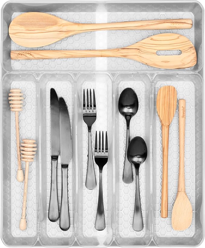 - ORGANIZE CUTLERY: Straighten up kitchen drawers with this compact silverware tray. Keep cutlery in separate compartments to organize the forks, spoons and knives. Open hexagon base allows dirt and dust to fall through, keeping your cutlery cleaner.