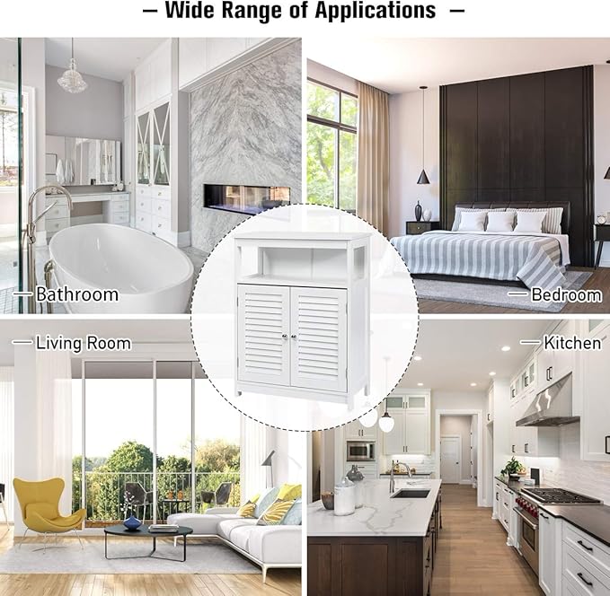 - Large Storage Space: This bathroom cabinet can make full use of the available space to provide an ideal storage solution. Wide top and open shelf are suitable for potted plants, aromatherapy, photo frames, magazines, etc. And the cabinet with shutter doors provides additional hidden storage for towels, shower gel or toilet paper.