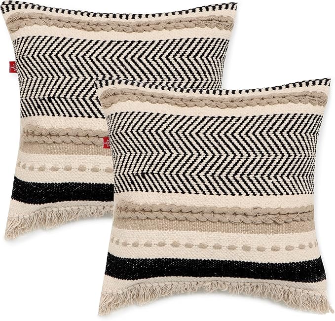 - High-Quality 100% Cotton: Made with premium quality 100% cotton fabric, they measure 18 x 18 Inch / 45 x 45cm (1-1.5 cm deviation) and come in set of 2 decorative cushion covers. The pillowcases are designed to fit perfectly on 18"x18" pillow inserts/fillers. For a fuller and plump look, 20"x20" filler can be used. Our pillow covers offer durability, breathability, and a soft touch. Experience the comfort and luxury of natural fibers in your home. PILLOW INSERTS ARE NOT INCLUDED.