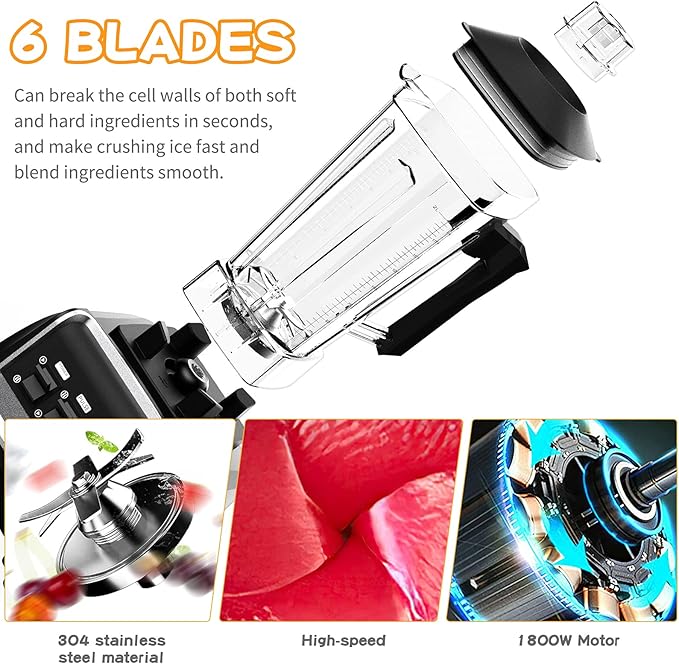 - 【2200W Powerful Motor & 6 Blades】With 6 blades blenders, it can handle the toughest ingredients, this smoothie blender allows you to crush ice faster, and blend ingredients smoother than other blenders. And 2200w powerful motor up to 42000 RPM, with overheat protection, strong heat dissipation, and smooth ventilation system, can continuously use