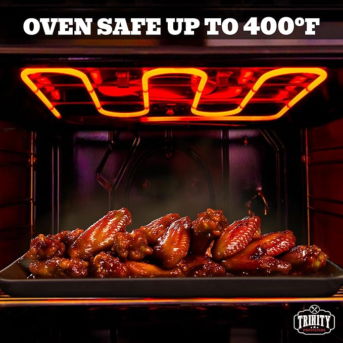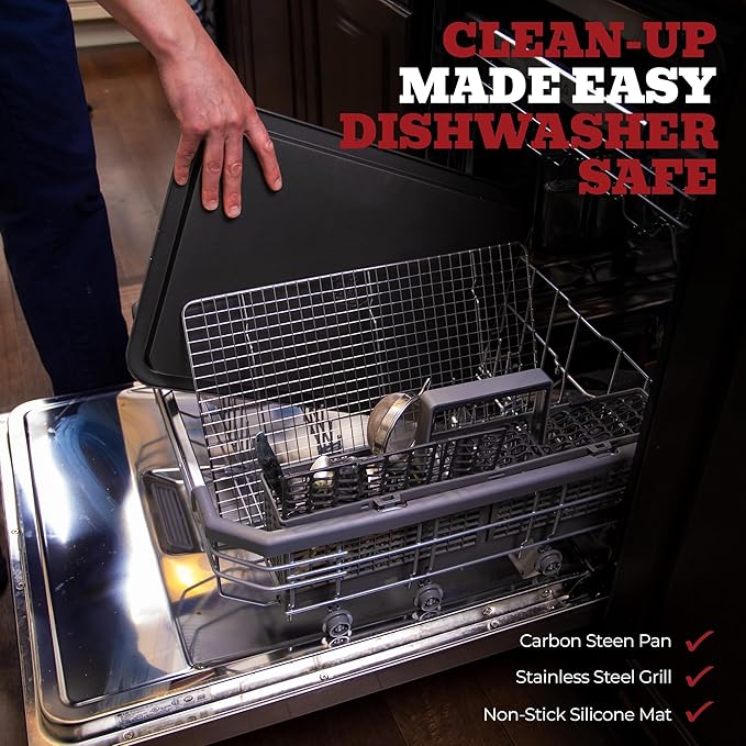 - DISHWASHER AND OVEN SAFE Our carbon steel non-stick resting pan, stainless steel cooling rack, and silicone baking mat are dishwasher safe and oven safe. Clean up after grilling with ease.