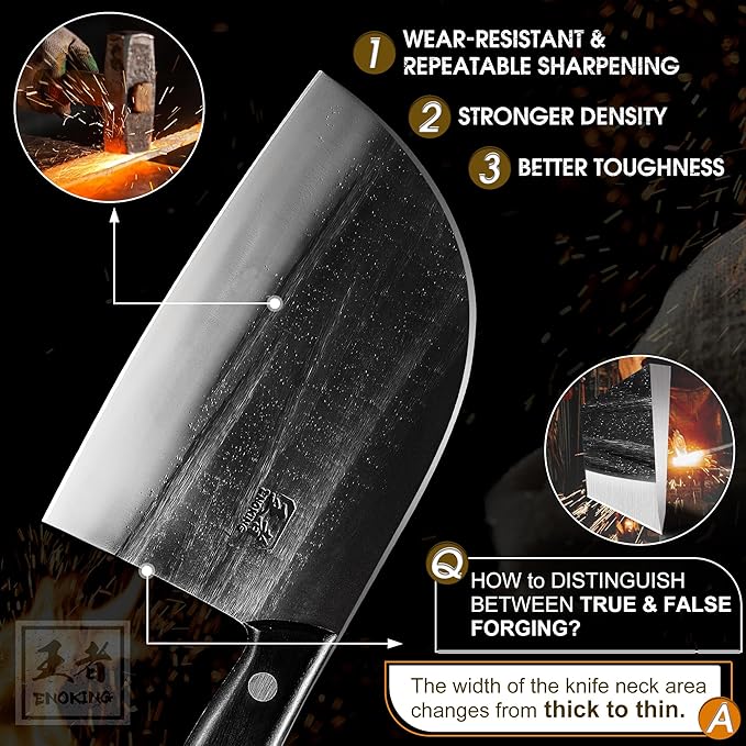 - Ancient Forging Process - ENOKING meat cleaver is forged by skilled craftsmens who forging knives many years, each Serbian chef knife will be hammering, quenching, high-temperature tempering, cyclic forging at least seven times, meantime we will eliminated unqualified knife to ensure every Enoking cleaver will work well.