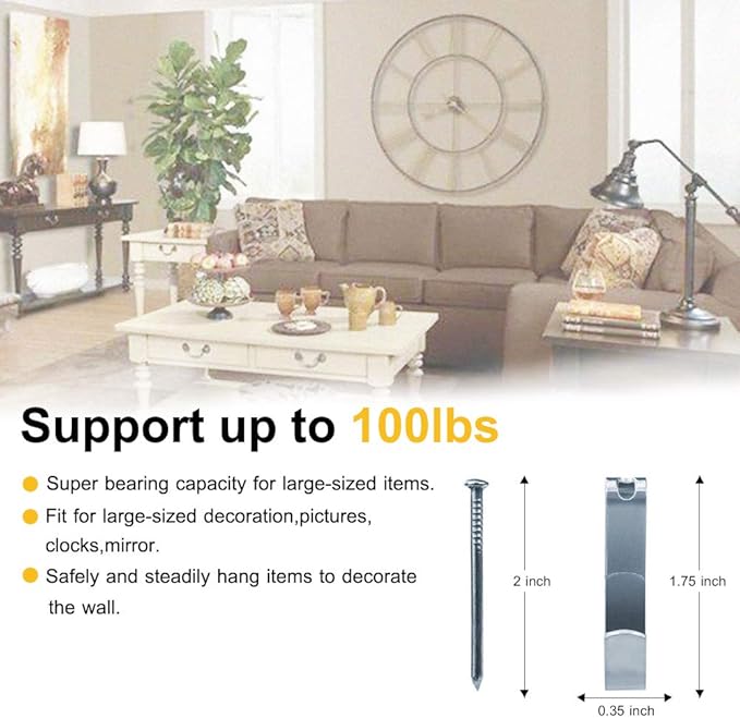 - 【Super Bearing Capacity】This picture hooks can support up to 100lbs, which steadily hang large-sized pictures,clocks,decoration,mirror,pot plant. No falling items exist! It will protect your loved hanging items and avoid to injury your families