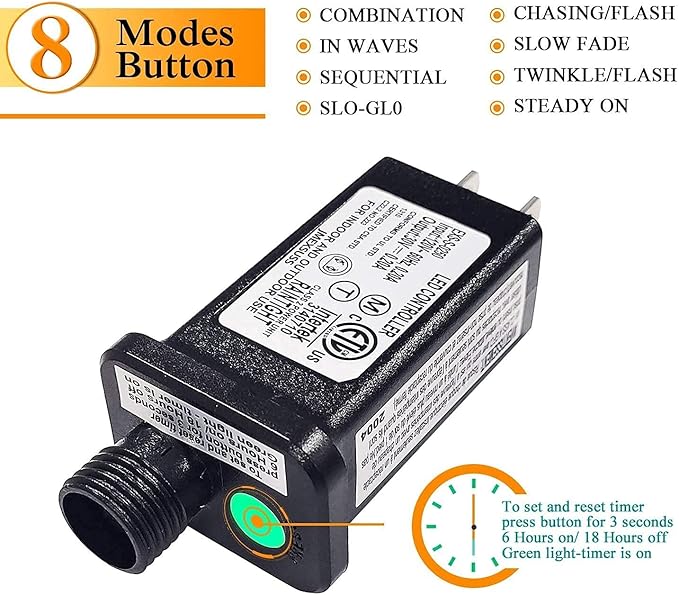 - [8 Lighting Modes & Timer] 8 lighting modes can meet your different needs on different occasions, you can change the mode by pressing the button on the transformer, including Waves, Combination, Fading, Fireflies, Chasing, Twinkle, Fading slowly, and Steady-on. In addition, Our outdoor purple Halloween lights also have a timing function, which automatically turns on for 6 hours and turns off for 18 hour, long press the button on the controller for 3 seconds to complete the timing function