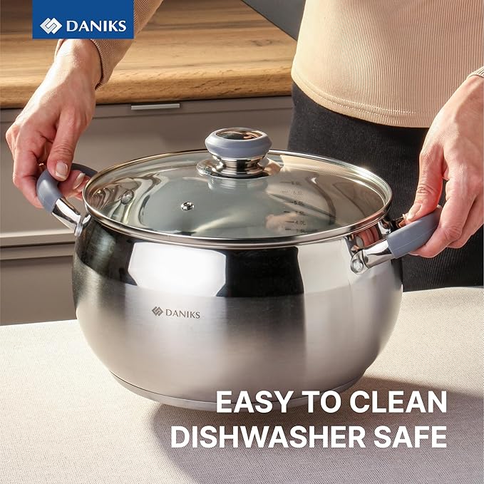 Daniks Modern Stainless Steel Stock Pot with Glass Lid – Induction 7 Quart, Dishwasher Safe, Heatproof Handles, For Soup, Pasta, Stew, Silver