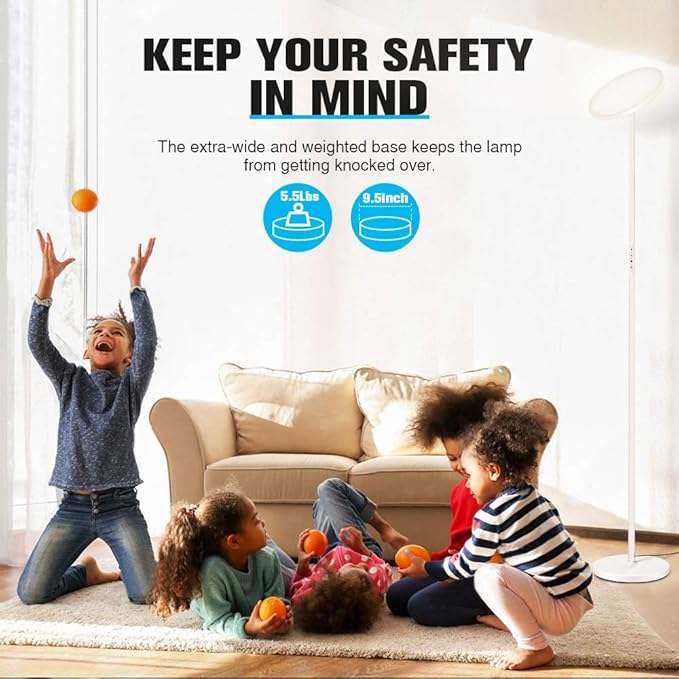 - Easy to Assemble & Sturdy: The standing floor lamp is super easy to assemble, no tools are needed, just screw all sections of the lamp poles together following the instruction. The led torchiere floor lamp comes with a flexible lamp head, which can be rotated up to 360 degrees to adjust the light your desire. The weighted base(5.5lbs) provides stability for the lamp and does not wobble or tip over that easily. You needn't worry about your kids or pet knocking it down.