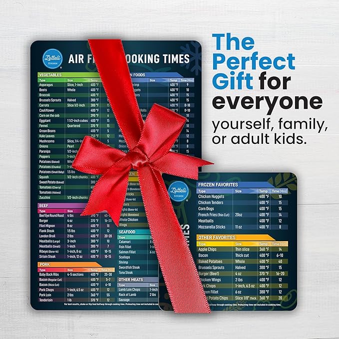 - PERFECT HOUSEWARMING GIFT: Presented in attractive packaging, our air fryer cheat sheet magnet is a thoughtful gift for anyone who loves to cook. Perfect for anyone, Lotteli makes cooking easier and more enjoyable for both experienced chefs and beginners alike.